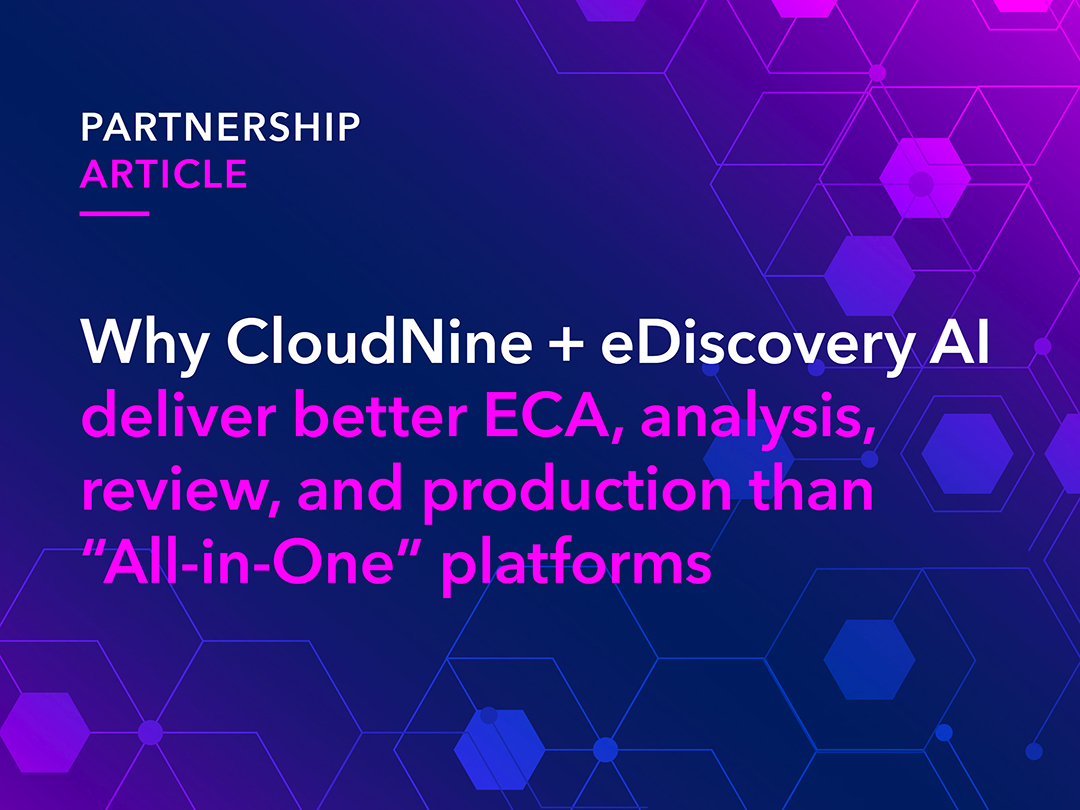 Legal teams today face increasingly complex data from emails and documents to mobile and collaboration platforms. While many vendors offer all-in-one eDiscovery solutions, these often sacrifice flexibility and performance for convenience. Learn how the CloudNine and eDiscovery AI partnership outperforms traditional all-in-one solutions with unmatched Early Case Intelligence™ (ECI) analysis, review, and production.