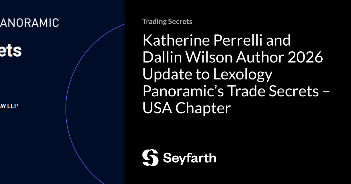 Seyfarth partners Katherine Perrelli and Dallin Wilson co-authored the United States chapter of Lexology Panoramic’s Trade Secrets 2026 Report. The chapter offers a comprehensive overview of trade secret protection in the U.S., highlighting recent legal developments, enforcement trends, and best practices for safeguarding proprietary information. Among the emerging issues addressed in this year’s report is... Continue Reading